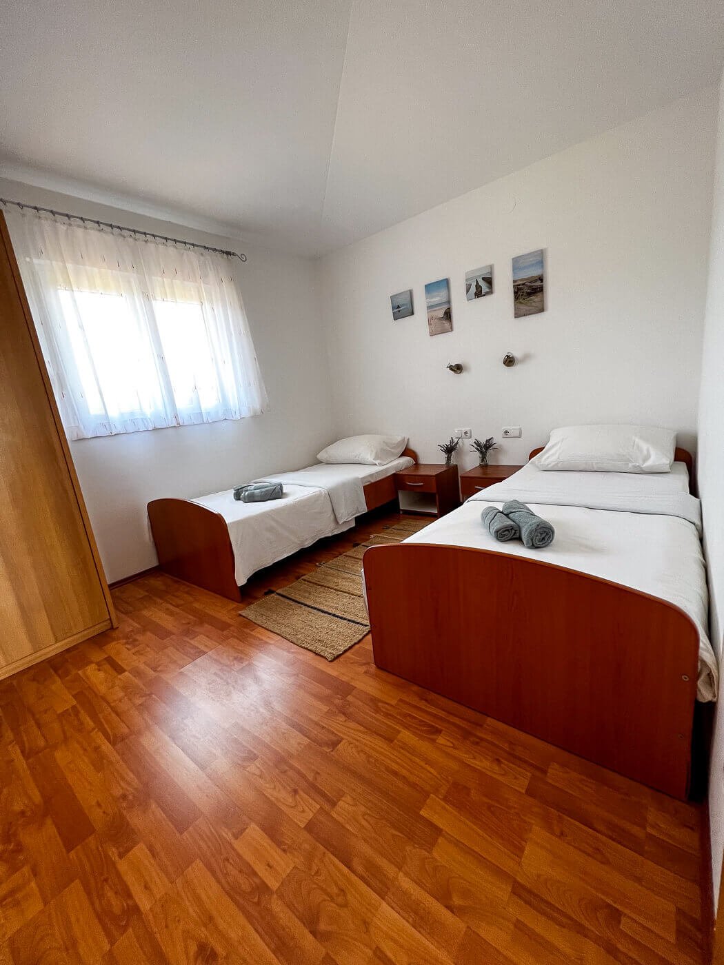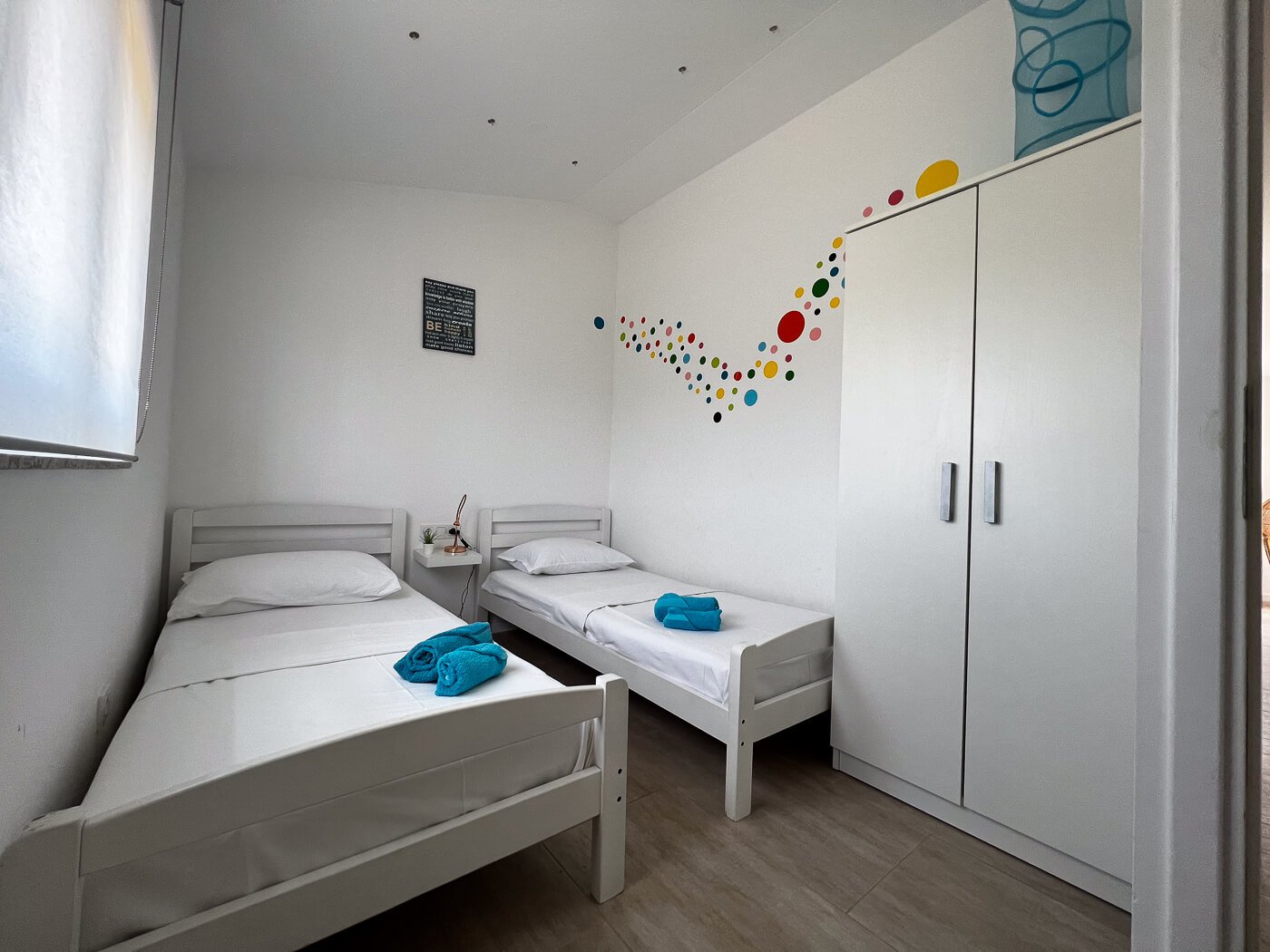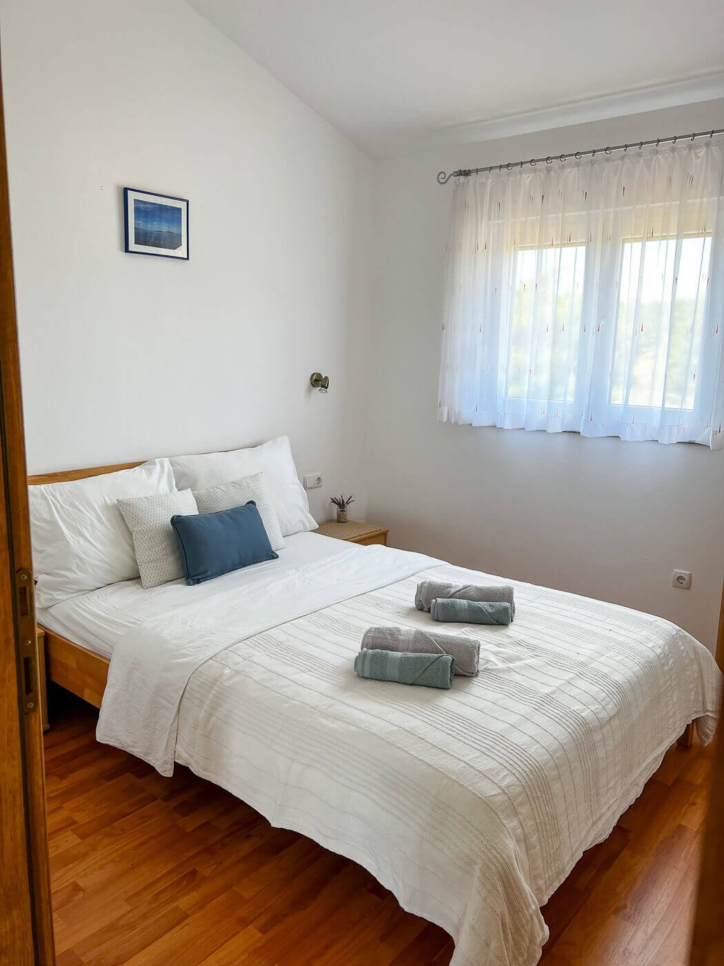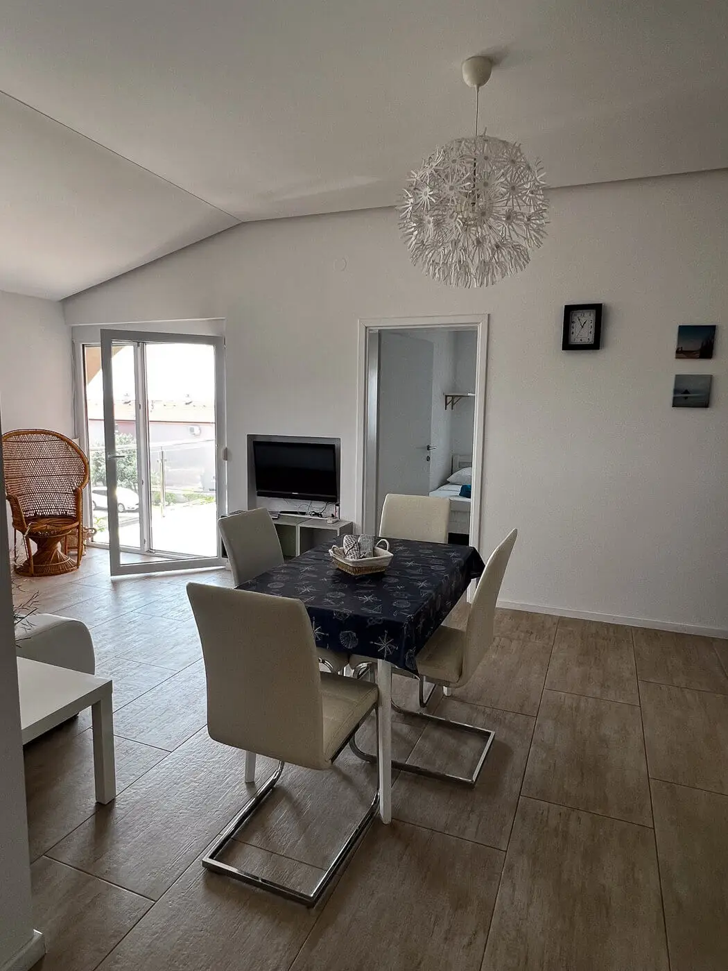 Elegantný apartmán s dvomi priestrannými spálňami, útulnou obývačkou, moderným WC, kúpeľňou a plne vybavenou kuchyňou. Tento štýlový apartmán je dokonalým miestom pre relaxáciu a pohodlie počas vášho pobytu na ostrove Vir v Chorvátsku. S vkusným dizajnom a praktickým vybavením vám poskytuje maximálny komfort a súkromie. Užite si nezabudnuteľnú dovolenku v tomto apartmáne s dvomi priestrannými spálňami, kde sa perfektne spája štýl, pohodlie a kvalita. Oslňujúca terasa vám zároveň umožňuje vychutnávať vonkajšie prostredie a príjemné okolie. Vzdialenosť apartmánu od pláže je 10 min. pešo